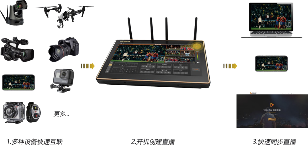 NSCaster X1是一款功能高度集成化的导播平板,内置11.6寸全高清触控显示屏。 集多机位切换、录制、播出、调音、字幕、监视等功能为一体,同时内置4G聚合模块,满足不同场合的直播网络需求。 一身才华,一触即播,净重1KG,以小于传统的身躯容纳媒体行业最新的思想